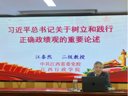 为进一步推进树立和践行正确政绩观学习教育走深走实,3月25日下午,学校举办机关党委第7期“知行大讲堂”,邀请了江西省委党校二级教授、研究生导师、江西省红色基因传承研究基地首席专家江泰然教授作题为《习近平总书记关于树立和践行正确政绩观的重要论述》的专题辅导报告,组织部副部长陈玲芳主持会议,机关各部门处级干部、党员代表共90余人聆听了报告。